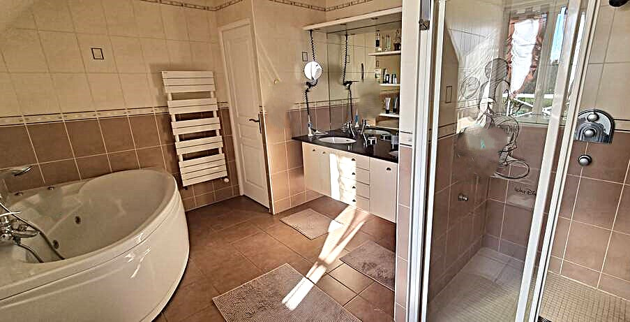 Un palier en mezzanine dessert 4 grandes chambres, dont une suite parentale supplémentaire avec dressings et salle de bains privative, et une sdb avec douche indépendante. Idéal pour une grande famille ou recevoir vos proches en toute intimité.