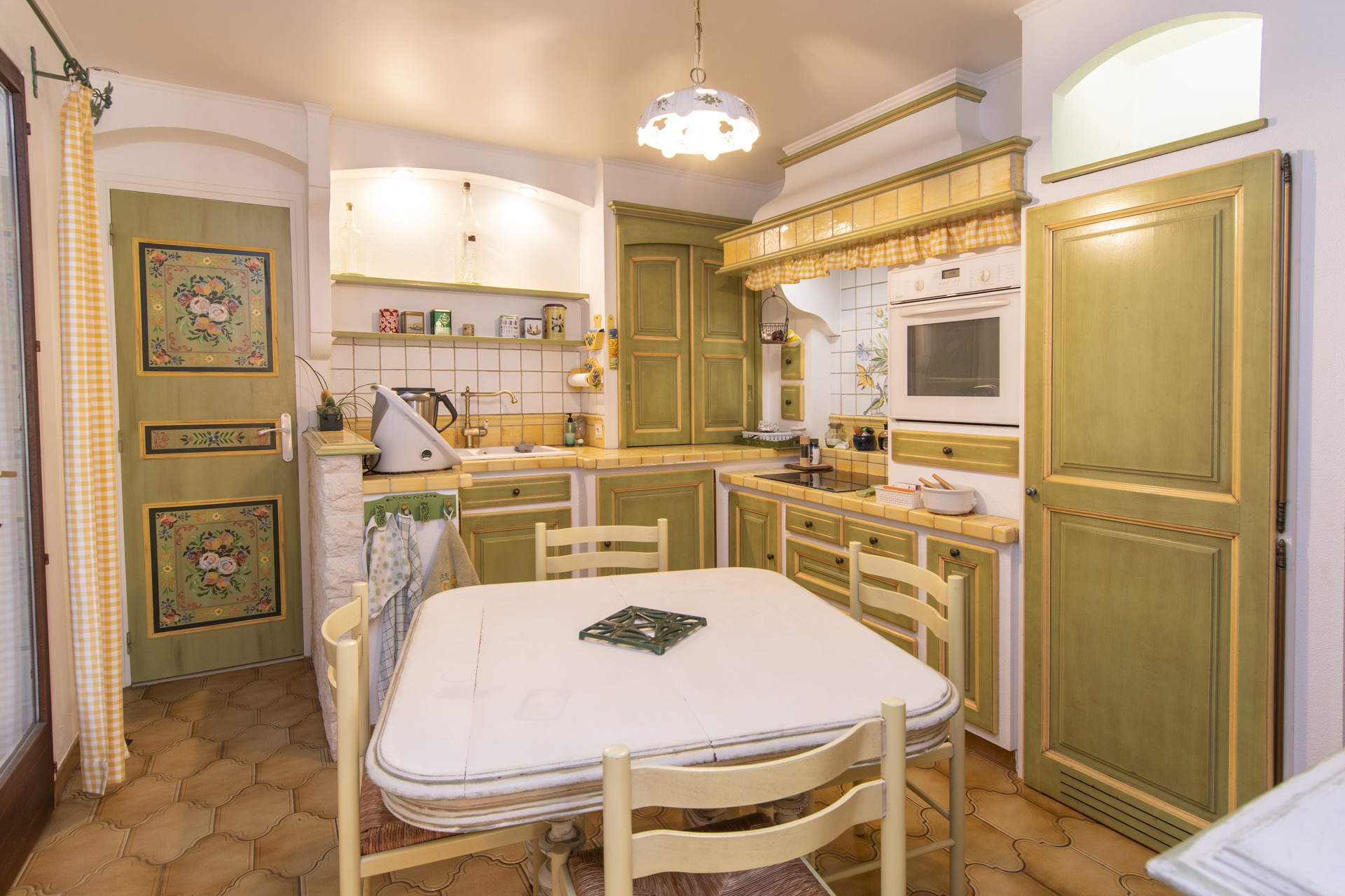 Une cuisine aménagée et équipée avec porte fenêtre donnant accès sur la terrasse (avec une pièce buanderie)
