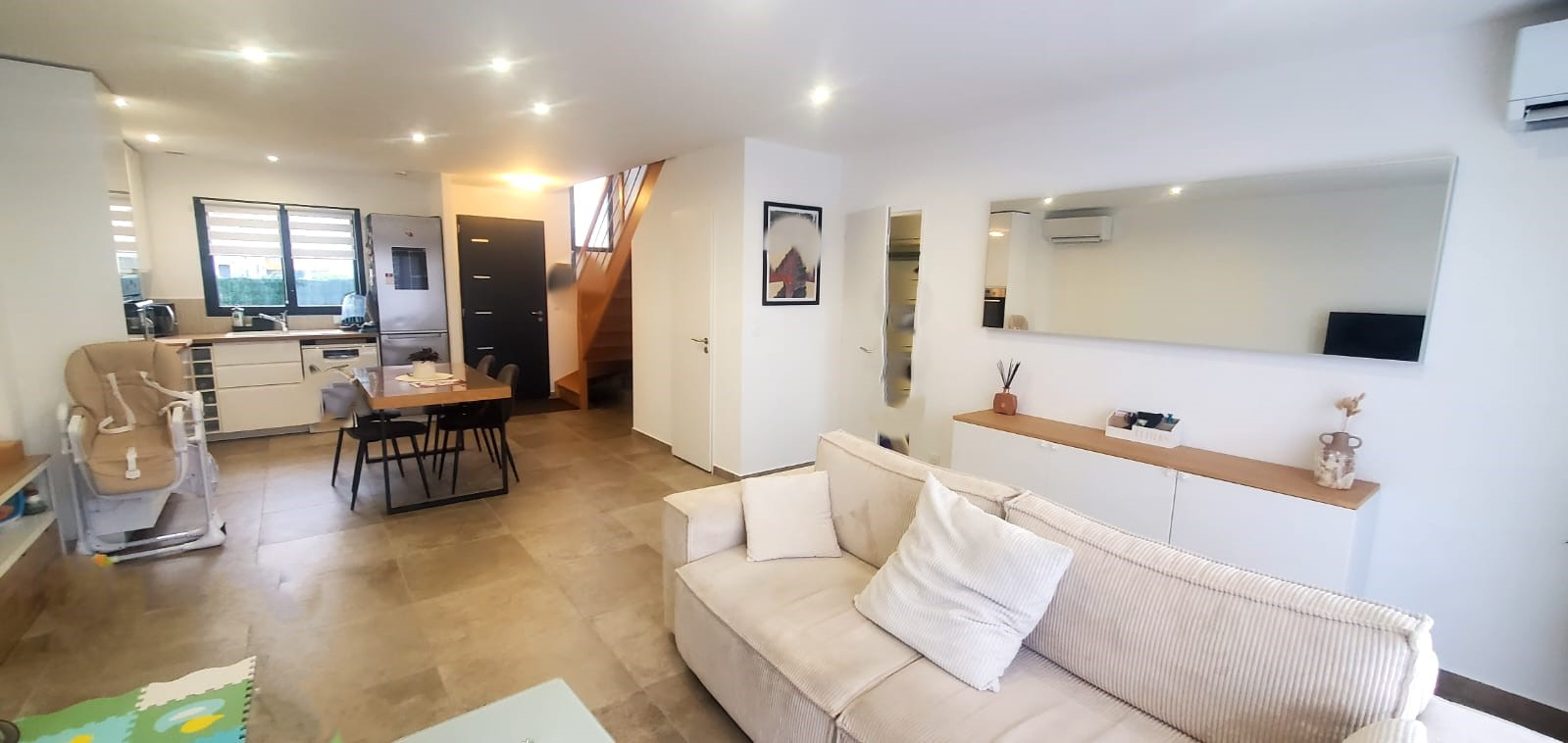 Superbe cuisine Ouverte (US) entièrement équipée s'ouvrant sur un lumineux séjour/salle à manger. Cet espace de vie est le coeur de la maison, idéal pour la convivialité.